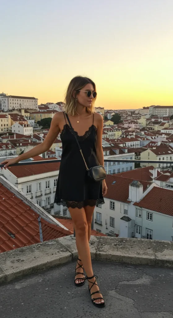 This black slip dress features delicate lace detailing around the neckline and hem, adding a touch of elegance and femininity to the simple design. The dress is flowy yet flattering, offering a relaxed silhouette that’s perfect for warm evenings. Paired with strappy sandals and a small black handbag, this outfit is ideal for a casual evening out or a stylish dinner in the city. The backdrop of rooftops and the sunset gives it a dreamy, almost cinematic feel.