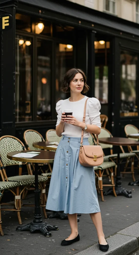 This outfit is the perfect mix of classic and casual. The white puff-sleeve top adds a bit of femininity, while the light blue button-down skirt keeps things fresh and relaxed for a warm summer day. The beige crossbody bag and simple black flats complete the look, adding the right amount of chic without being too formal. The backdrop of the quaint café in a European city brings everything together, making this outfit perfect for a stroll, a coffee break, or a casual outing.