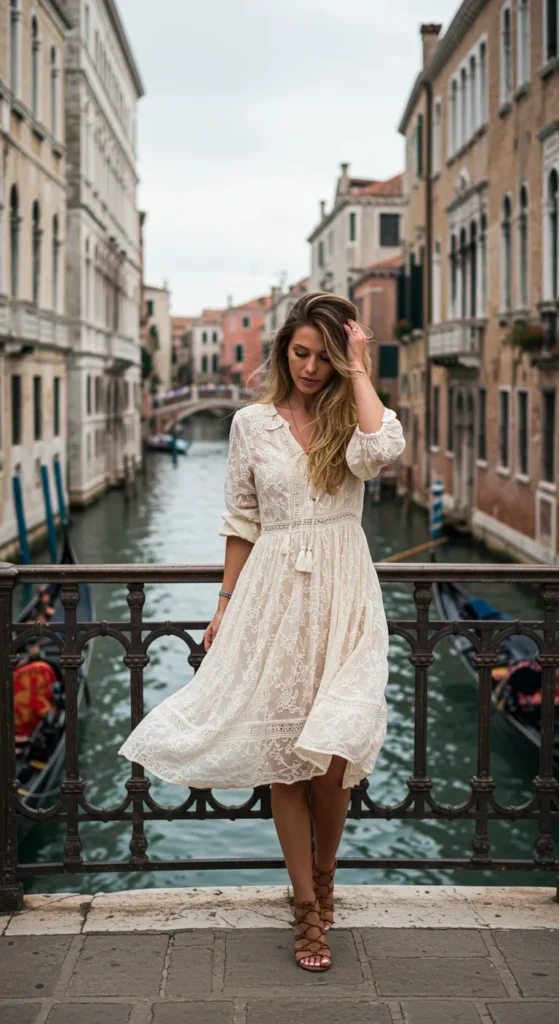This effortless boho-inspired dress is perfect for a dreamy day in Venice. The lightweight cream-colored lace dress flows gracefully, with delicate detailing along the hem and sleeves. It features a button-up front with a playful tassel tie, adding a touch of whimsy to the overall look. The strappy gladiator sandals complete the outfit, making it both comfortable and stylish for wandering the beautiful canals. With the scenic Venetian backdrop, this outfit exudes relaxed elegance.