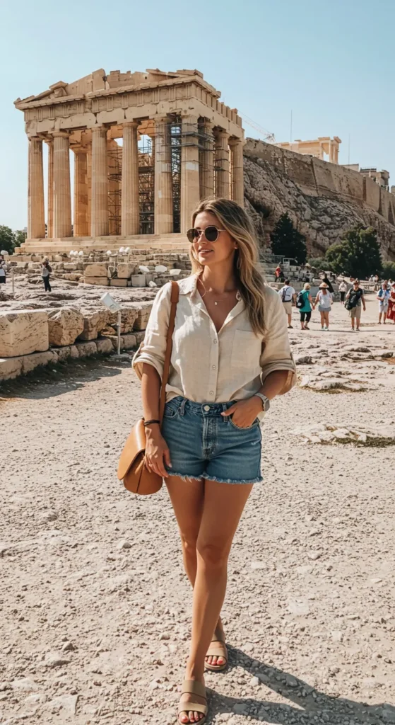 This outfit is a perfect blend of relaxed, stylish, and practical. The light, beige linen shirt offers just the right amount of breeze for those warm European summer days, while the high-waisted denim shorts are both flattering and comfortable for sightseeing. The simple sandals and a crossbody bag keep the look effortlessly chic and functional, while the round sunglasses add that extra flair of modern sophistication. The historical setting of the Parthenon behind adds an iconic touch to the ensemble, creating a chic vibe.