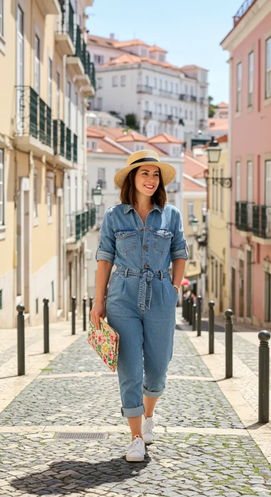 This chic summer outfit is the perfect blend of comfort and style, featuring a denim jumpsuit with a flattering cinched waist and cuffed pants for a relaxed yet put-together look. Paired with classic white sneakers, a straw hat, and a floral clutch, the outfit is all about embracing a laid-back vibe while exploring European streets. The denim on denim gives it a casual feel, while the accessories elevate it into something a bit more special for a day out.