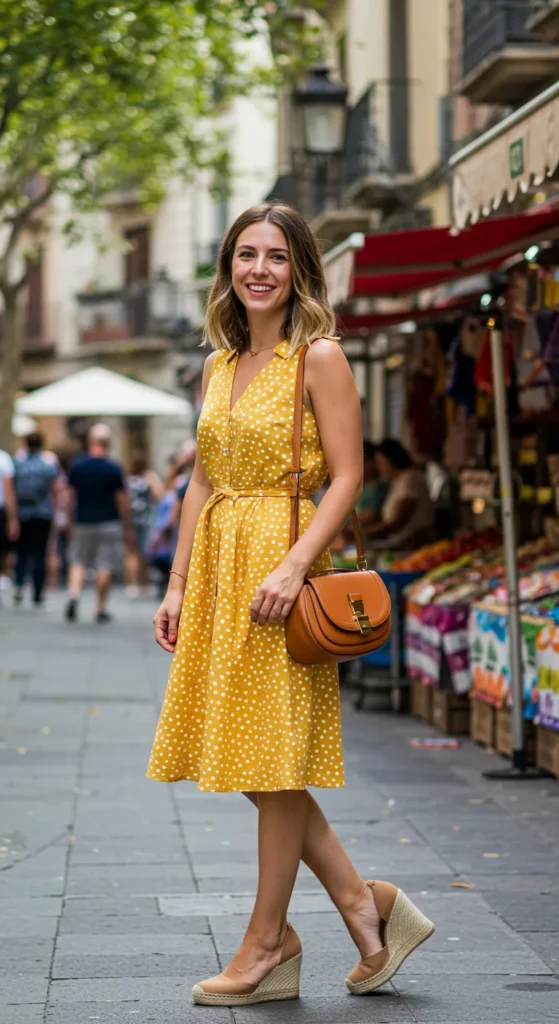 This vibrant yellow dress covered in playful white polka dots is an absolute mood booster! The dress features a flattering V-neckline and a cinched waist, creating a feminine silhouette. With a flattering knee-length skirt and a lightweight, breezy fabric, this dress is ideal for a casual day out in a European city. Paired with neutral wedge sandals and a cute tan handbag, it’s effortlessly chic without being overdone.