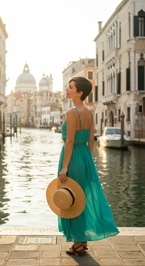 I’m absolutely in love with how this dress feels like the epitome of summer! The color is stunning, especially with the warm, golden light reflecting off the water in the background. The dress is so breathable and free-flowing, making it ideal for warm weather. And let’s not forget how versatile it is—whether you’re walking along canals or sipping drinks on a terrace, this outfit is bound to keep you looking cool and feeling fabulous!