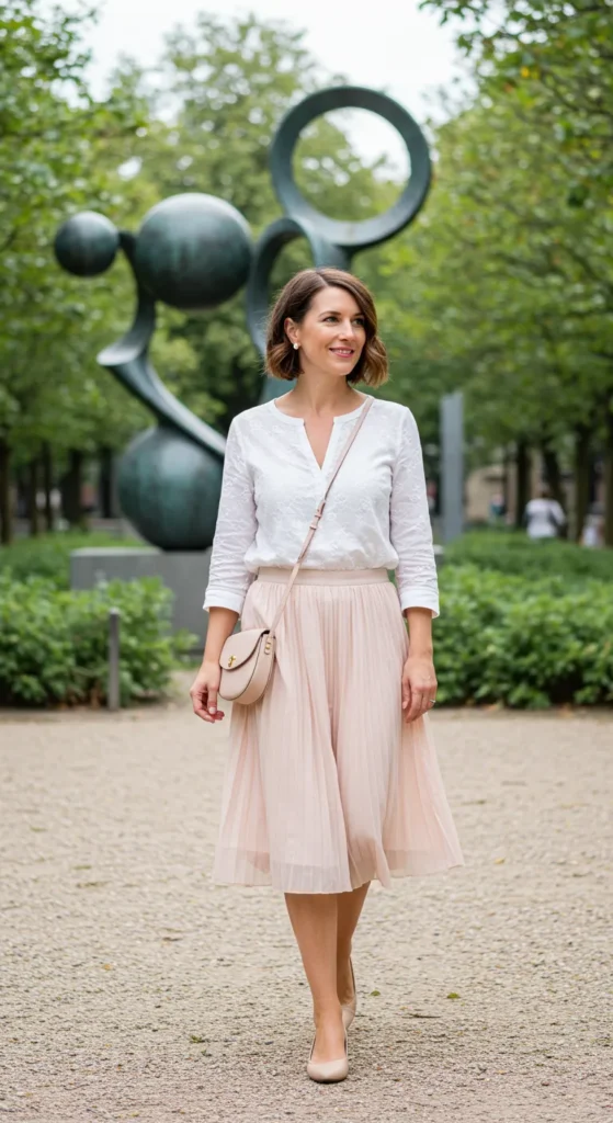 I love how this outfit is so timeless and versatile! The flowy skirt adds just the right amount of movement, and the blouse keeps it classy without being too formal. The colors are soothing, and I think it’s a perfect choice for anyone who wants to look stylish without being over-the-top. It’s the kind of outfit you can wear to walk around the city or enjoy a museum visit while still feeling effortlessly put together.