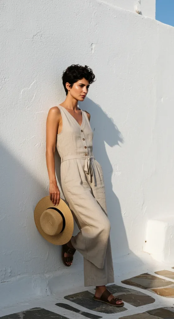 This effortlessly chic linen jumpsuit is the ultimate summer staple. It features a button-down front, a flattering V-neckline, and a cinched waist with a tie belt, giving it both structure and flow. The neutral beige color is light and airy, perfect for a sunny day spent exploring European streets. The outfit is paired with comfortable brown sandals and a stylish straw hat, making it practical yet polished for any casual outing.