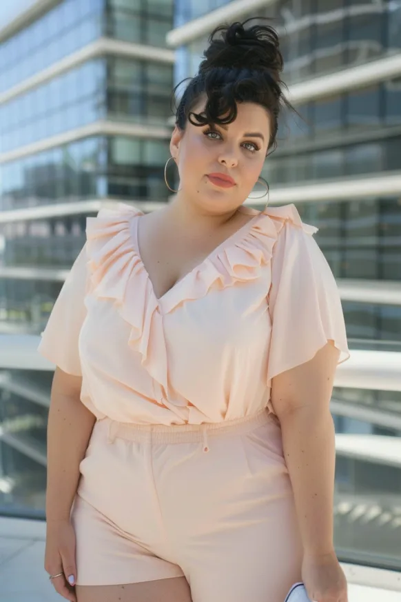 I absolutely love how this romper combines comfort with a chic style. The soft peach color is just beautiful and flattering for all skin tones, and the ruffled detail gives it that extra fun and feminine touch. It’s perfect for when you want to keep things cool but still look put-together. I can imagine wearing this while out for a weekend brunch or just strolling around the city—it’s so versatile! This outfit is a true must-have for anyone looking to brighten up their summer wardrobe.