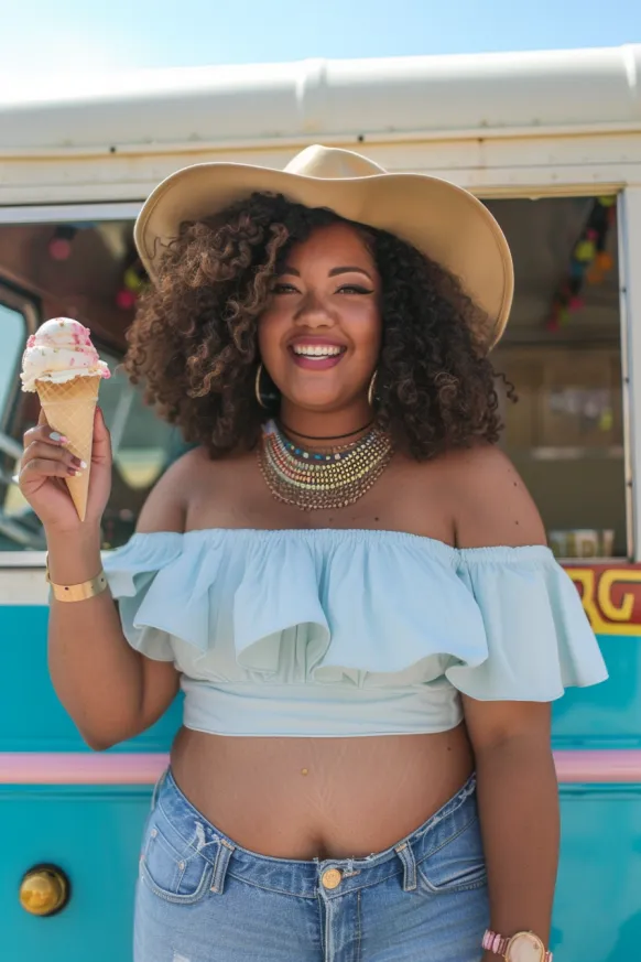 I am totally obsessed with how this outfit combines comfort and style in the best way possible! The ruffles on the top are so feminine and fun, while the off-shoulder cut is both flirty and chic. The pastel color is refreshing and looks amazing in the sunlight, plus the denim shorts give the outfit just the right amount of edge. It’s the perfect look for a relaxed day of ice cream and shopping, and it’s one of those outfits that will make you feel confident, cool, and ready for anything.