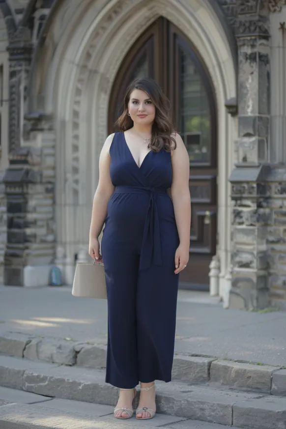 This navy blue jumpsuit is the epitome of chic elegance. The deep V-neck and wrap front create a flattering shape, while the tie belt cinches at the waist, accentuating your curves. The wide-leg style gives it an effortlessly sophisticated vibe, making it perfect for both day and evening occasions. Paired with a simple beige handbag and strappy sandals, this jumpsuit exudes timeless class while keeping things comfortable and stylish.
