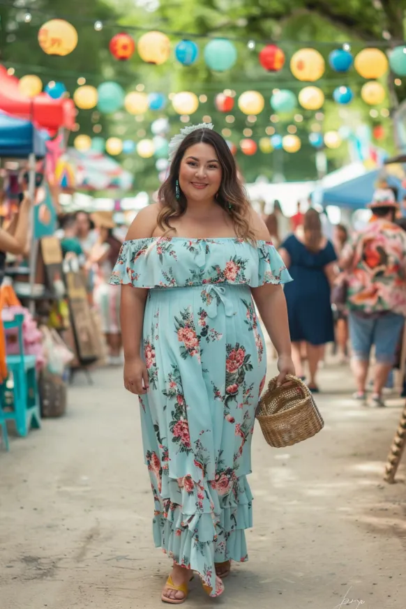This soft, floral off-shoulder maxi dress is the perfect mix of chic and laid-back vibes. With its flowy skirt and fitted waist, it offers both comfort and shape. The off-the-shoulder neckline and ruffled detailing bring a fun, feminine touch to the look, while the vibrant floral print in shades of pink and green adds a lively pop of color. Paired with yellow sandals and a straw bag, this dress is ideal for an afternoon at the market or a sunny stroll in the park.