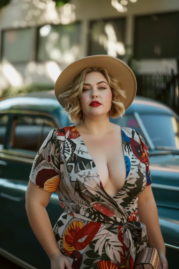 I love how this dress effortlessly combines bold prints with flattering cuts. The wrap dress style is a total winner for accentuating curves, and the floral print is absolutely eye-catching. It’s the perfect outfit for a fun day out or even a casual night out with friends. Plus, that wide-brimmed hat adds just the right amount of glam, making this the perfect choice for those days when you want to feel both stylish and relaxed. It’s versatile, flattering, and gives off major “I’m fabulous” vibes!