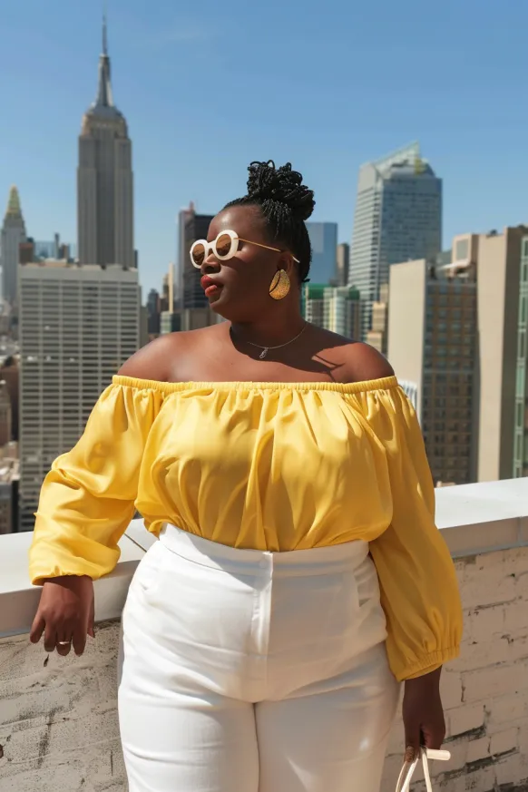This outfit screams sunny vibes and city chic! The off-shoulder yellow top brings a playful yet sophisticated touch with its billowy sleeves and relaxed fit. Paired with high-waisted white pants, the look feels fresh, breathable, and perfect for any warm-weather outing. Add a stylish straw hat and oversized sunglasses, and you’ve got yourself a look that exudes confidence and class. The simple white pants create a sleek contrast to the bold yellow, making the top really pop.
