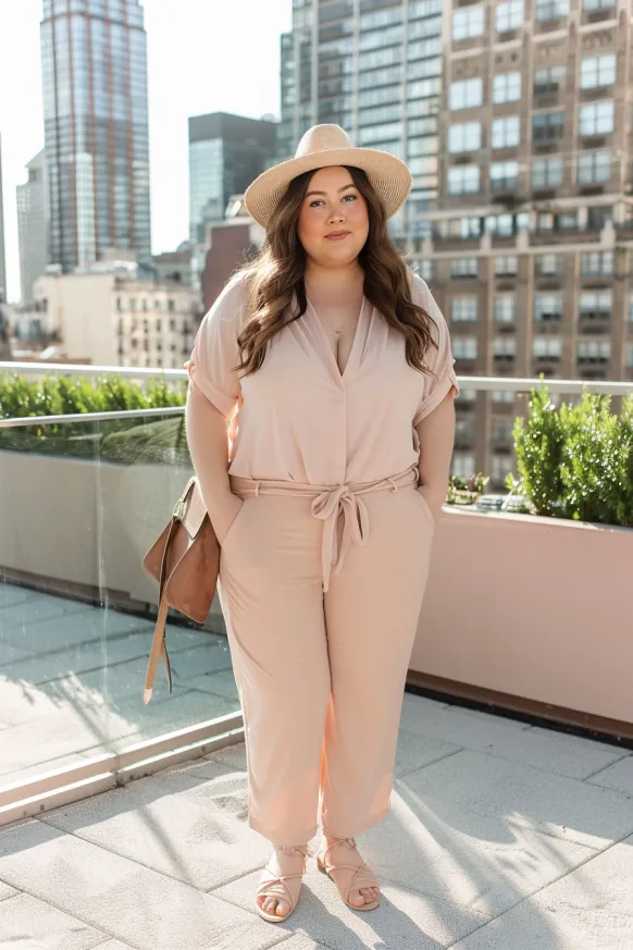 This stylish, soft peach-colored jumpsuit is the perfect combination of comfort and chic style. With its loose, relaxed fit and tie waist, it effortlessly highlights your curves while offering a laid-back, comfortable feel. The short sleeves and v-neckline add a touch of elegance, and the wide-legged design gives it a breezy vibe—ideal for those sunny summer days. Paired with simple sandals and a wide-brimmed hat, it’s the ultimate outfit for city sightseeing or a rooftop brunch.