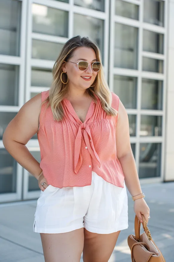 This outfit combines comfort and style effortlessly. The top features a playful tie-front design with soft pleats, perfect for those hot summer days. Paired with flowy white shorts, the ensemble provides just the right amount of coverage while keeping things breezy and light. The subtle coral color of the top pops beautifully against the simplicity of the white shorts. Accessories like gold hoop earrings and sunglasses finish off the look, giving it a chic, casual vibe that’s perfect for a sunny afternoon out.