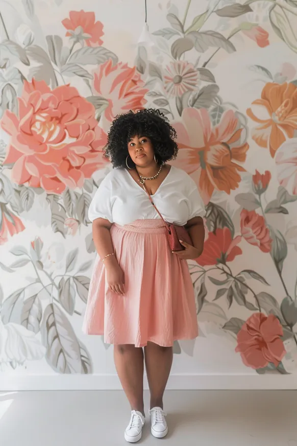 I’m loving how this look feels so laid-back yet put together. The soft pink skirt is just the right amount of feminine without being too sweet, and the white top adds a crisp balance. It’s perfect for running errands or meeting friends for a casual outing. Plus, it’s so versatile – you can easily dress it up with a few accessories or keep it casual with sneakers. The whole vibe just screams effortless cool.
