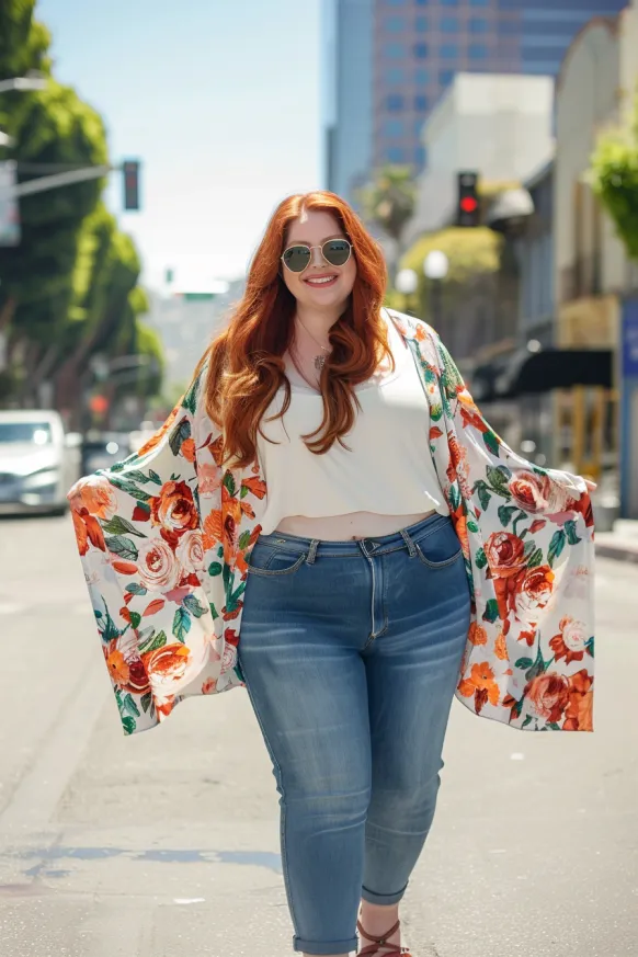 This outfit brings a sense of effortless chic to any casual summer day. A simple white top is paired with high-waisted jeans for comfort and style, while the floral kimono adds a fun, boho-inspired flair. The kimono, with its vibrant florals in shades of orange and green, perfectly complements the relaxed vibe of the look. Paired with neutral sandals and oversized sunglasses, this outfit strikes the ideal balance between laid-back and fashionable.
