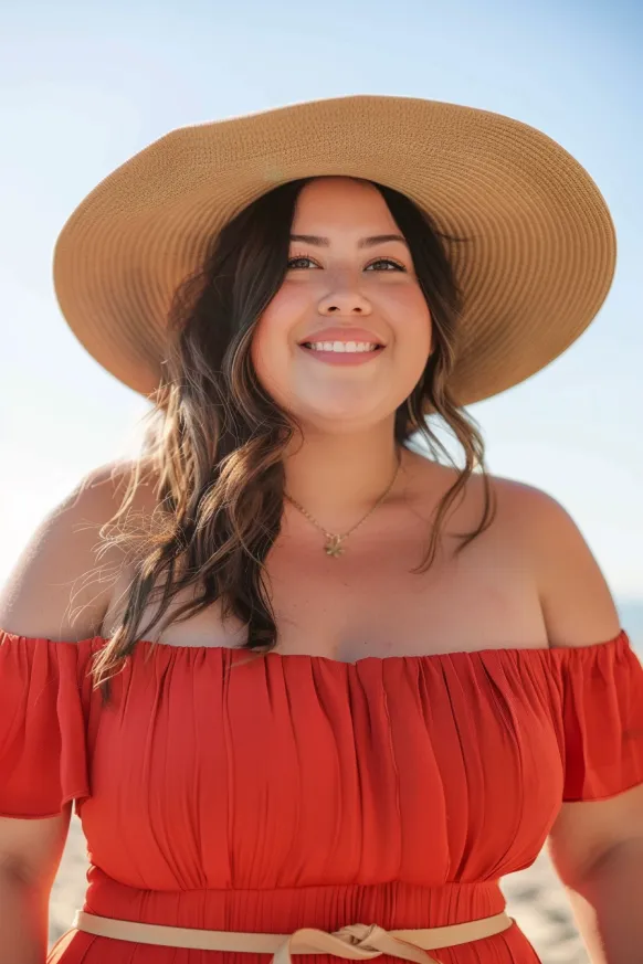 I absolutely adore this outfit because it’s not only easy to wear but also looks incredibly stylish. The red hue is bold and attention-grabbing, making it perfect for a day out in the sun. The off-the-shoulder neckline adds a touch of flirtiness, while the comfortable fit ensures you’ll feel relaxed all day. Plus, the hat gives it that extra summery flair—this is one of those outfits I could see myself wearing all season long, and I’d definitely feel confident and beautiful in it!