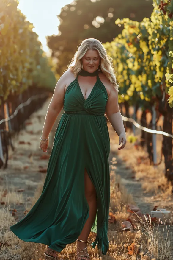 This elegant deep green dress exudes sophistication and charm. The dress features a sultry halter neckline with a twist at the bust, adding structure while maintaining a flowy, relaxed fit throughout the rest of the dress. A daring slit on the side shows just enough leg, perfect for those warm evenings when you want to look polished but feel comfortable. It’s the ideal gown for an outdoor gathering, a vineyard stroll, or even a sunset dinner by the beach. The fabric drapes beautifully, creating a flattering silhouette that highlights curves in all the right ways.