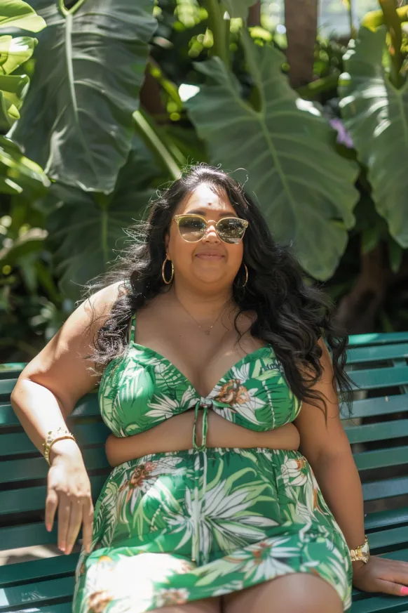 This vibrant green bikini set with tropical palm leaves is made for sun-soaked days! The halter top with a cute tie detail adds a bit of flirtiness, while the matching high-waisted skirt gives a flattering, laid-back vibe. The relaxed, feminine cut enhances the figure in all the right places while providing comfort for a day by the pool or lounging on the beach. A pair of gold hoop earrings and oversized sunglasses complete the look, making it both chic and effortlessly cool.