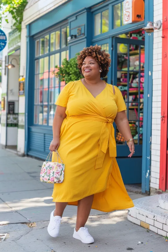 This vibrant yellow wrap dress is a fun, energizing choice for summer days. With its flattering V-neckline and tie waist, it accentuates the curves while keeping things breezy and comfortable. The dress’s midi length is perfect for showing off those cute sneakers, making it an ideal choice for a casual day out in the city or a brunch date with friends. The lively yellow hue adds a pop of color, while the simple yet elegant design ensures it remains chic and easy to wear.