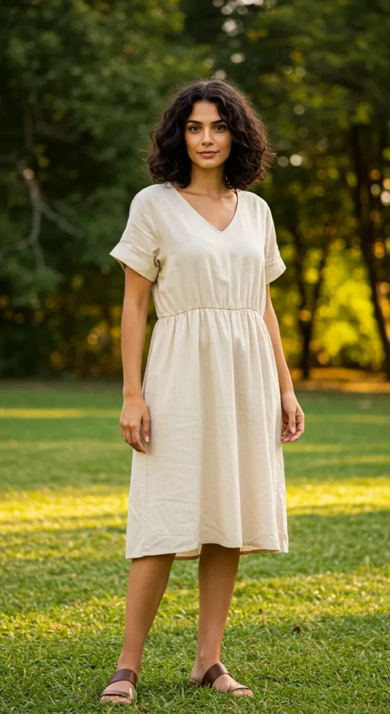 This elegant modest summer outfit features a simple yet stylish beige dress, perfect for warm weather. The dress is made of a light, breathable fabric, making it ideal for the summer months. With a flattering V-neck and a waistline that cinches slightly, this dress offers both comfort and style. The short sleeves add a casual, relaxed touch, while the classic knee-length cut makes it appropriate for a variety of occasions, from casual outings to more formal gatherings.