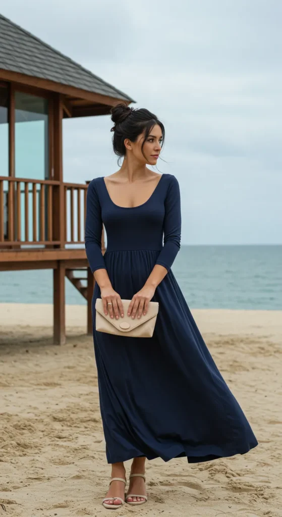 This outfit showcases a beautiful, deep navy blue maxi dress. It features flattering three-quarter length sleeves and a modest scoop neckline. The dress has a fitted bodice leading into a long, flowing skirt that gracefully sweeps the ankles. It’s styled elegantly with neutral-colored heeled sandals and a simple cream clutch, while her hair is swept up in a chic bun.