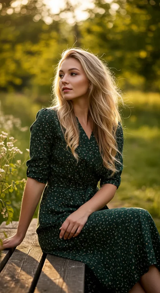 This outfit features a lovely dark green midi dress scattered with a delicate white floral print. The dress has elbow-length sleeves, a flattering V-neckline that appears to be a wrap or button-front style, and a defined waist, possibly with a self-tie belt. The skirt flows down to a midi length, offering comfortable coverage.