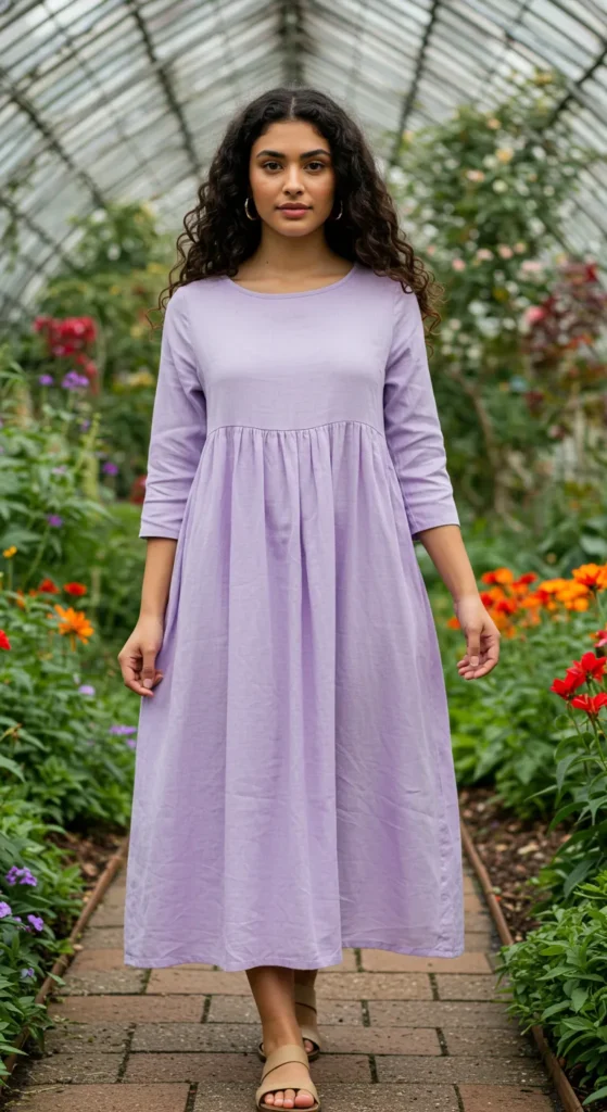 Check out this effortlessly beautiful midi dress in a soft lilac shade! It features a simple round neckline, comfortable three-quarter length sleeves, and an empire waistline that gathers gently under the bust. The skirt flows loosely down to a midi length, looking super comfy and breezy. The fabric appears to be a lightweight linen or cotton, perfect for warm weather, and it’s paired simply with flat sandals.