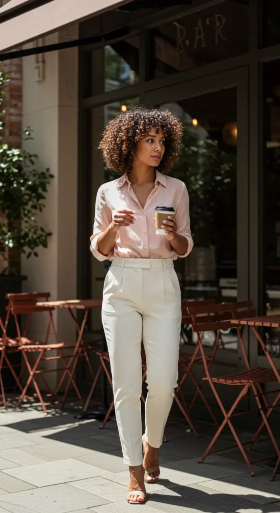 This stylish look features a classic light pink button-down shirt, casually styled with rolled-up long sleeves. It’s smartly tucked into crisp, high-waisted white trousers that are tailored for a clean silhouette, ending around the ankle. The outfit is grounded with simple neutral heeled sandals, perfect for a polished vibe as she grabs her morning coffee.