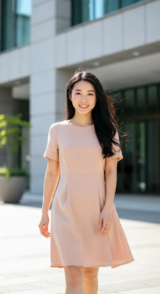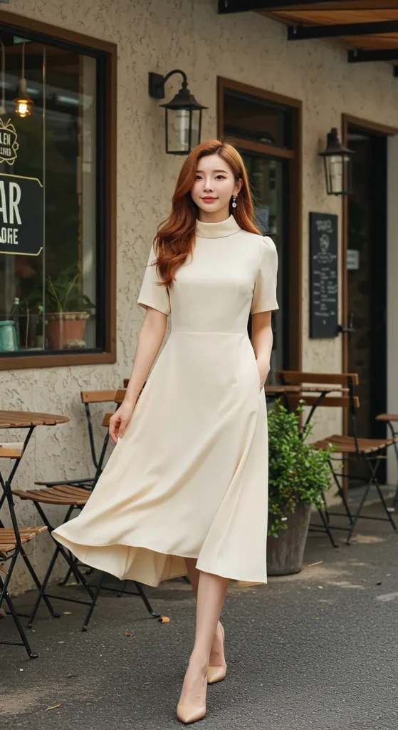 This beautiful dress is showcased in a lovely cream or pale beige color. It features a modest high neckline, comfortable short sleeves, and a fitted waist that flows into a graceful A-line midi skirt reaching mid-calf. The silhouette is incredibly flattering and classic, and it even looks like it has pockets! She’s paired it perfectly with pointed nude pumps.