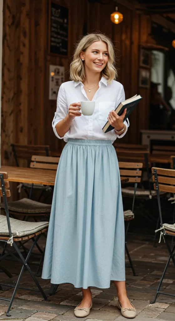 This chic summer outfit combines a classic white button-up shirt with a soft, light blue skirt. The white shirt, with its relaxed fit and rolled-up sleeves, exudes effortless elegance. Paired with the skirt, which has a flattering elastic waistband and flows gently to a midi length, the look is both modest and stylish. The outfit is completed with neutral-toned ballet flats, making it both comfortable and practical for everyday wear.