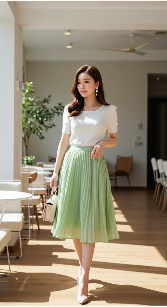 This gorgeous outfit pairs a simple, fitted white top featuring short sleeves and a modest scoop neck with a stunning light green pleated midi skirt. The skirt looks like it’s made from a lovely lightweight, flowy fabric, perfect for catching a summer breeze, and it falls gracefully below the knee. She’s accessorized it beautifully with elegant pearl drop earrings, pointed nude heels, and a chic little handbag.