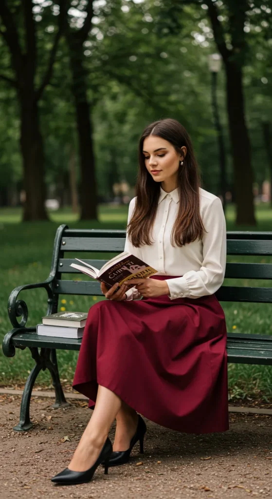 I just think this combination is absolutely timeless and so incredibly chic! The long-sleeved blouse and midi skirt offer wonderful modest coverage, but the way it’s styled feels so sophisticated and not at all frumpy. The rich burgundy skirt paired with the bright white top is such a striking contrast. It feels perfect for a smart summer occasion, maybe work if the dress code allows, or even a nice dinner out. It’s just effortlessly elegant!