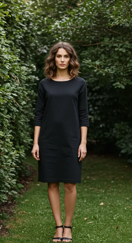 Here’s a super versatile and classic black dress! It features a simple shift silhouette, hitting right around the knee, with elegant three-quarter length sleeves and a clean bateau neckline. The look is understated and chic, paired simply with black ankle-strap sandals. It’s the definition of a wardrobe staple.