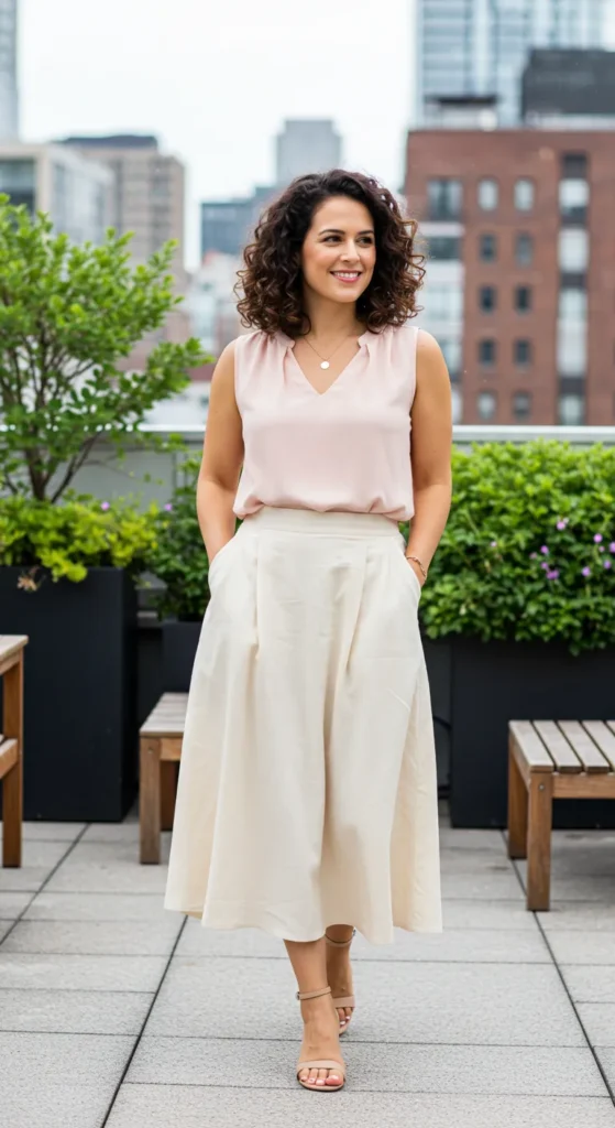 This outfit pairs a lovely sleeveless blush pink top, featuring a soft V-neckline, with a high-waisted midi skirt in a creamy off-white shade. The top is neatly tucked in, highlighting the waist, and the full A-line skirt falls gracefully to mid-calf, complete with practical pockets. Simple nude ankle-strap sandals and a delicate gold necklace finish off this elegant look.