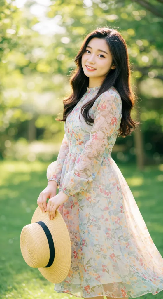 This absolutely beautiful dress features long, sheer bishop sleeves and a modest high neckline, crafted from a lightweight, flowy fabric. It boasts a delicate, multi-colored floral print on a light background, creating a soft and romantic look. The dress cinches at the waist before falling into an airy, mid-length skirt, perfectly complemented by the addition of a classic straw sun hat.