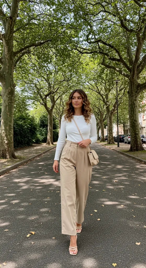 This outfit pairs a simple, fitted white long-sleeved top with high-waisted, wide-leg trousers in a lovely beige hue. The look is accessorized with coordinating neutral pieces like strappy heeled sandals and a small crossbody bag. It’s a clean and put-together ensemble that relies on classic shapes and a soft color palette.