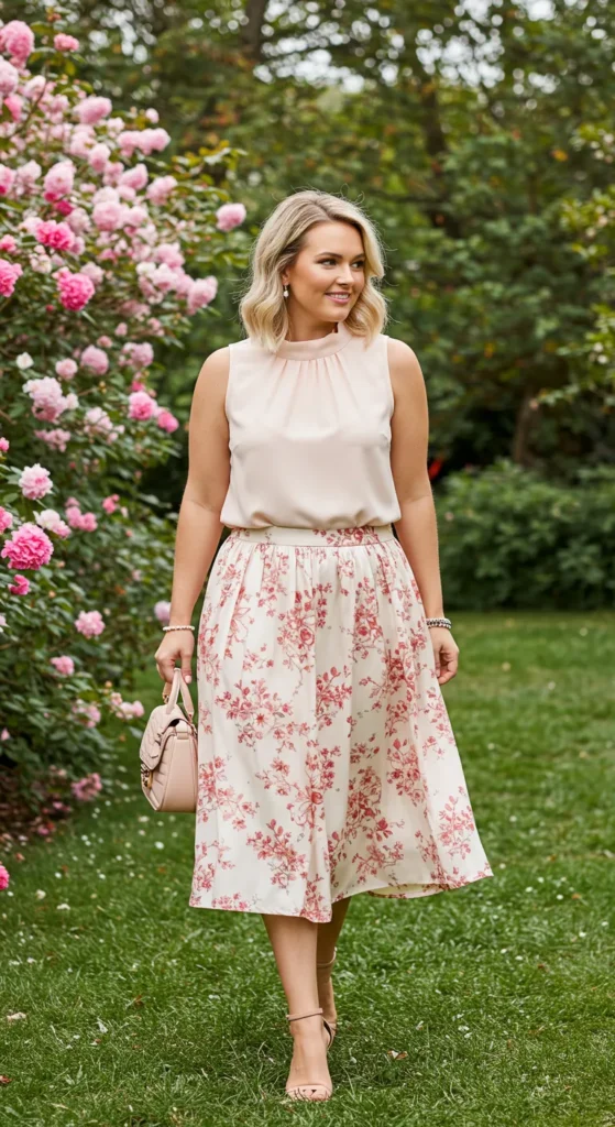 This lovely outfit features a soft blush pink sleeveless top with a gathered high neckline, tucked neatly into a beautiful A-line midi skirt. The skirt itself is an off-white base adorned with a delicate pink floral print. The look is completed with simple nude ankle-strap heels and a coordinating blush pink handbag.