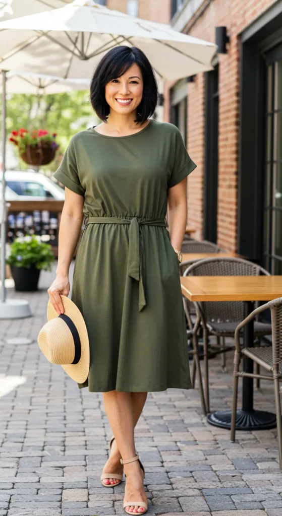 Here’s a super cute and comfy-looking olive green dress, perfect for everyday summer wear! It’s got a simple t-shirt style top with cuffed short sleeves and a classic round neck. The skirt falls to about the knee, and it cinches at the waist with a matching fabric tie belt. Plus, bonus points, it looks like it has pockets! She’s paired it with simple nude sandals and is holding a stylish straw hat.