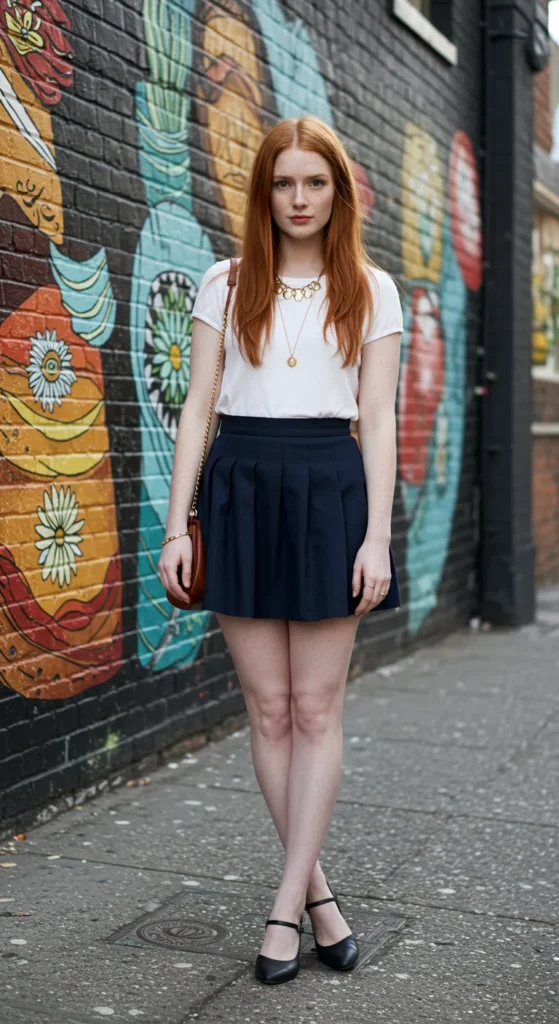 This outfit is a sweet and simple combo featuring a classic white crewneck t-shirt paired with a high-waisted, navy blue pleated mini skirt. The look is accessorized with delicate layered gold necklaces, a small brown crossbody bag, and practical black Mary Jane flats. It’s a clean, preppy style that’s easy to put together.