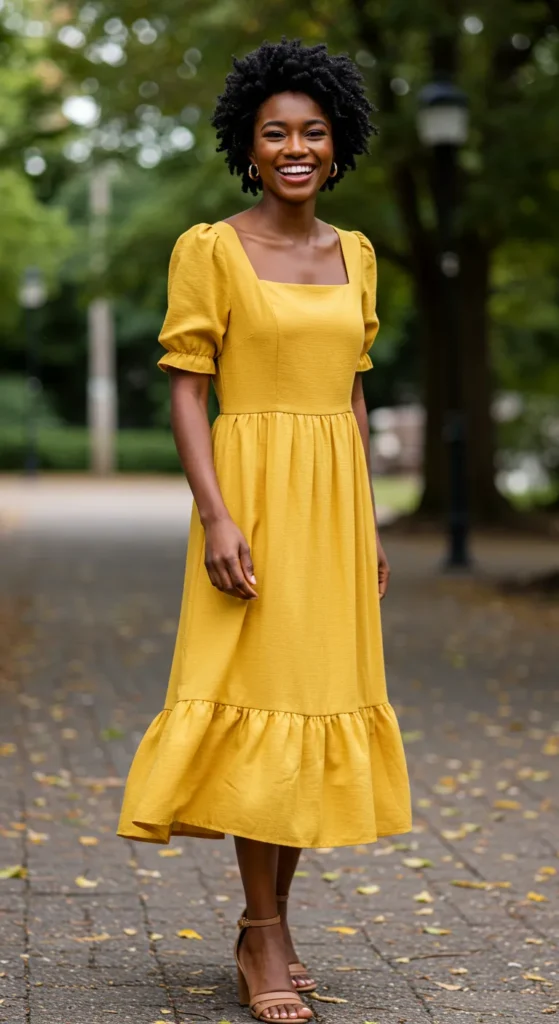 Seriously, how cheerful is this dress? I just love this vibrant yellow color for summer, it instantly makes me smile! The square neck and puff sleeves are so on-trend right now, but they still feel really classic and sweet. It provides great coverage with the midi length and sleeves, making it perfect for staying cool and comfortable while looking totally put-together for almost any daytime event. It’s just such a happy, effortless piece!