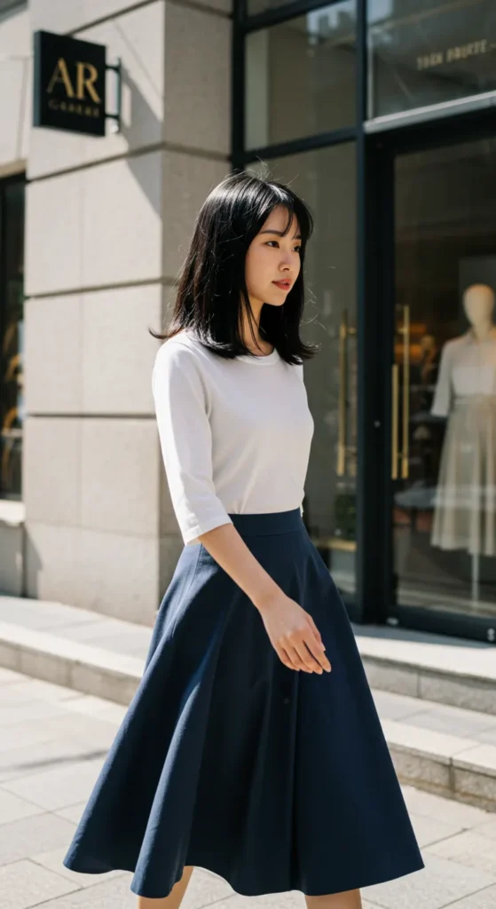 This outfit features a simple, well-fitting white top with classic three-quarter length sleeves and a crew neckline. It’s tucked into a high-waisted, full A-line midi skirt in a deep navy blue. The skirt has a lovely structure that gives it a beautiful flare as she walks. It’s a very clean and classic silhouette.