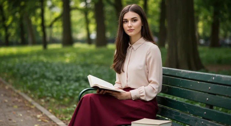 I just think this combination is absolutely timeless and so incredibly chic! The long-sleeved blouse and midi skirt offer wonderful modest coverage, but the way it’s styled feels so sophisticated and not at all frumpy. The rich burgundy skirt paired with the bright white top is such a striking contrast. It feels perfect for a smart summer occasion, maybe work if the dress code allows, or even a nice dinner out. It’s just effortlessly elegant!