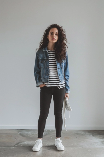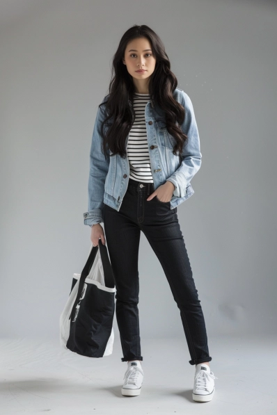 This outfit is all about nailing that timeless, casual look. The light denim jacket layered over a simple striped turtleneck brings a fresh, laid-back feel, while the black skinny jeans keep things sleek and chic. The rolled-up cuffs and white sneakers add an easy, cool-girl vibe, and that oversized tote bag is a fun, practical touch—perfect for carrying all your movie snacks (yes, we all sneak them in).