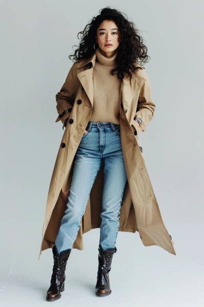 This look combines a timeless trench coat with cozy elements for a laid-back, stylish vibe. The classic beige trench coat is layered over a soft tan turtleneck sweater, adding warmth and comfort. Light-wash jeans bring in a casual feel, while the lace-up boots give the outfit a bit of rugged sophistication. The mix of textures—wool, denim, and leather—creates a polished, multi-dimensional look that feels effortless but chic.