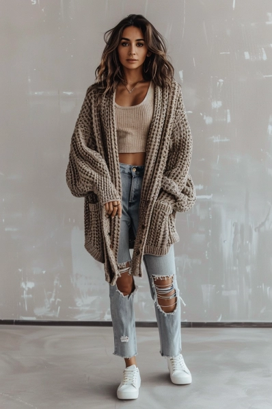 Cozy Knit Cardigan with Ripped Jeans
