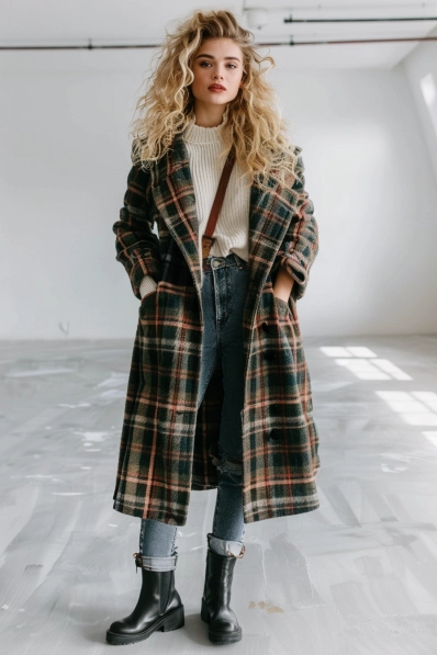This look is perfect for a movie date on a chilly day! The oversized plaid coat adds warmth and major style points, while the chunky cream knit sweater underneath keeps things cozy. High-waisted jeans and sturdy black boots complete the outfit, bringing a touch of ruggedness and practicality. The crossbody bag is the perfect finishing touch, adding a pop of detail without overshadowing the plaid coat.