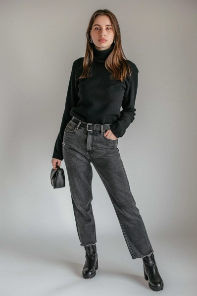 This outfit brings all the minimalist chic vibes with a classic black turtleneck tucked into high-waisted black jeans. The straight-leg cut of the jeans paired with black ankle boots keeps the look sleek and polished, while the small handbag adds a bit of elegance without distracting from the overall simplicity. It’s an understated yet sophisticated look that works perfectly for a cozy movie date or even a casual dinner afterward.