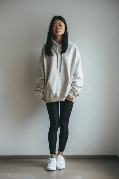 This outfit is all about comfort while still looking effortlessly cool. The oversized cream hoodie pairs perfectly with black leggings, creating a cozy yet sleek silhouette. The white sneakers add a clean, fresh vibe that keeps the look casual and sporty. It’s the kind of outfit that says, “I’m ready for a chill movie night,” while still being put together enough to grab a quick bite afterward.
