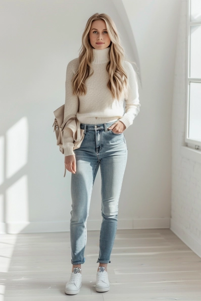 What I love most about this outfit is how light and airy it feels. The neutral palette makes it look so clean and put-together without trying too hard. The turtleneck is perfect for staying warm, and the jeans keep it casual yet refined. It’s the type of look that works for anything, whether you’re heading straight to the theater or grabbing lunch before the movie. Plus, those sneakers make it super comfy for a casual day out!