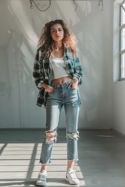 This outfit brings that relaxed, laid-back vibe with a cool, effortless twist. The oversized plaid shirt, layered over a cropped white tank, is perfect for keeping things casual and a little bit edgy. The ripped jeans add texture and character to the outfit, while the white sneakers make sure you stay comfortable for the entire date. It’s a simple, no-fuss look that’s ideal for a fun, relaxed movie night.